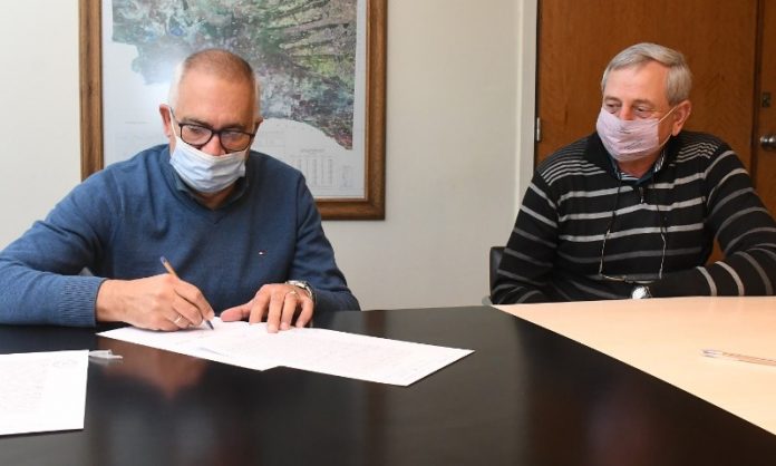 Esta mañana en el despacho del ministro de Obras y Servicios Públicos, Juan Ramón Garay; en el marco del Programa Provincial de Agua y Saneamiento, se firmó convenio con la Comisión de Fomento de Falucho, representada por el presidente Oscar Canonero.